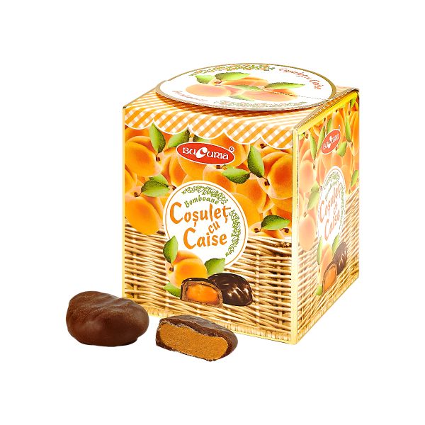 - Bomboane Bucuria – Coșuleț cu Caise, 250 g – Delicatețe cu cremă de caise și glazură fină de ciocolată Bomboane Bucuria – Coșuleț cu Caise, 250 g – Delicatețe cu cremă de caise și glazură fină de ciocolată