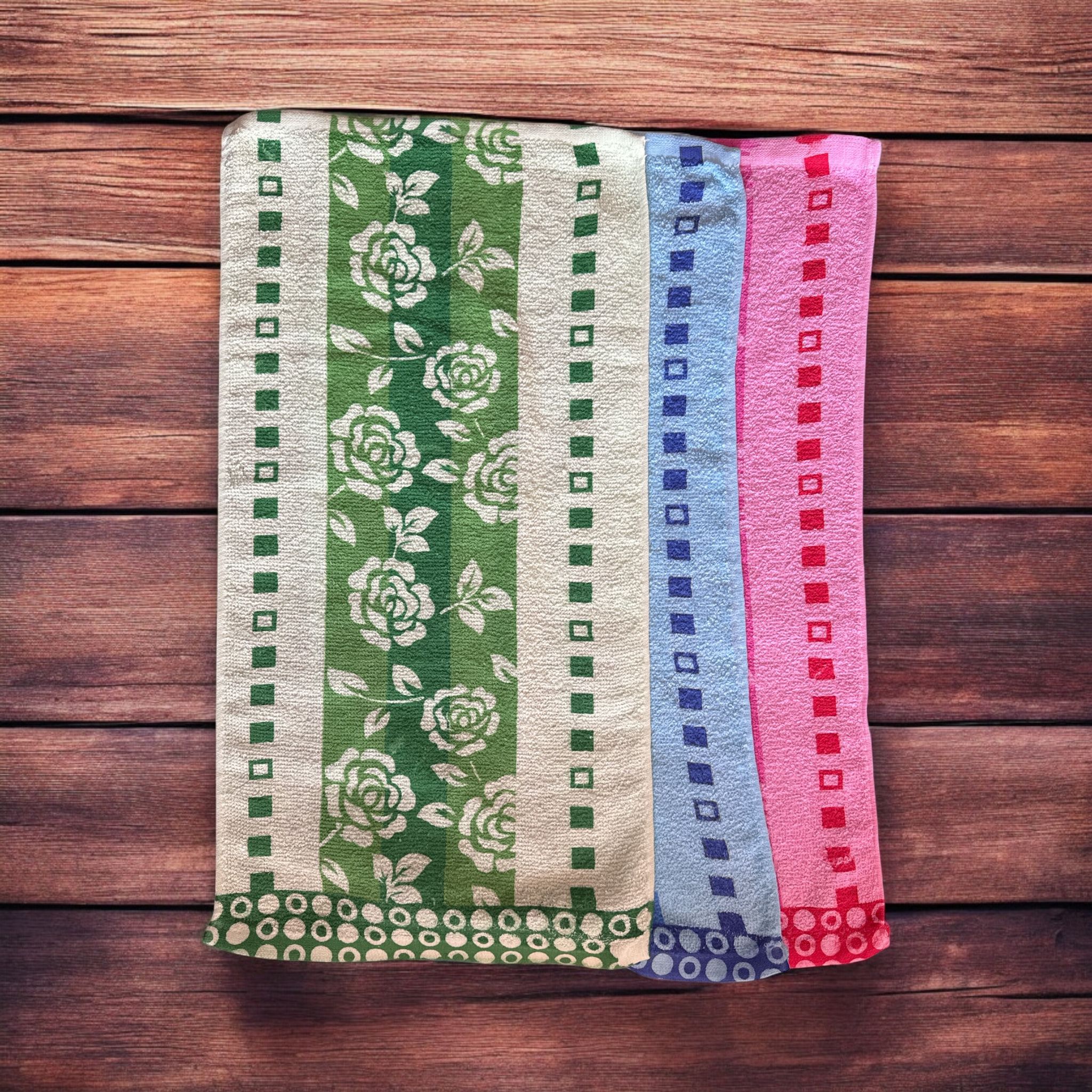 Realizate dintr-un material absorbant și ușor de întreținut, aceste prosoape au o dimensiune generoasă de 62 x 32 cm și vin în trei culori vibrante: verde, roz si albastru, fiecare decorat cu un model floral elegant și bordură geometrică.