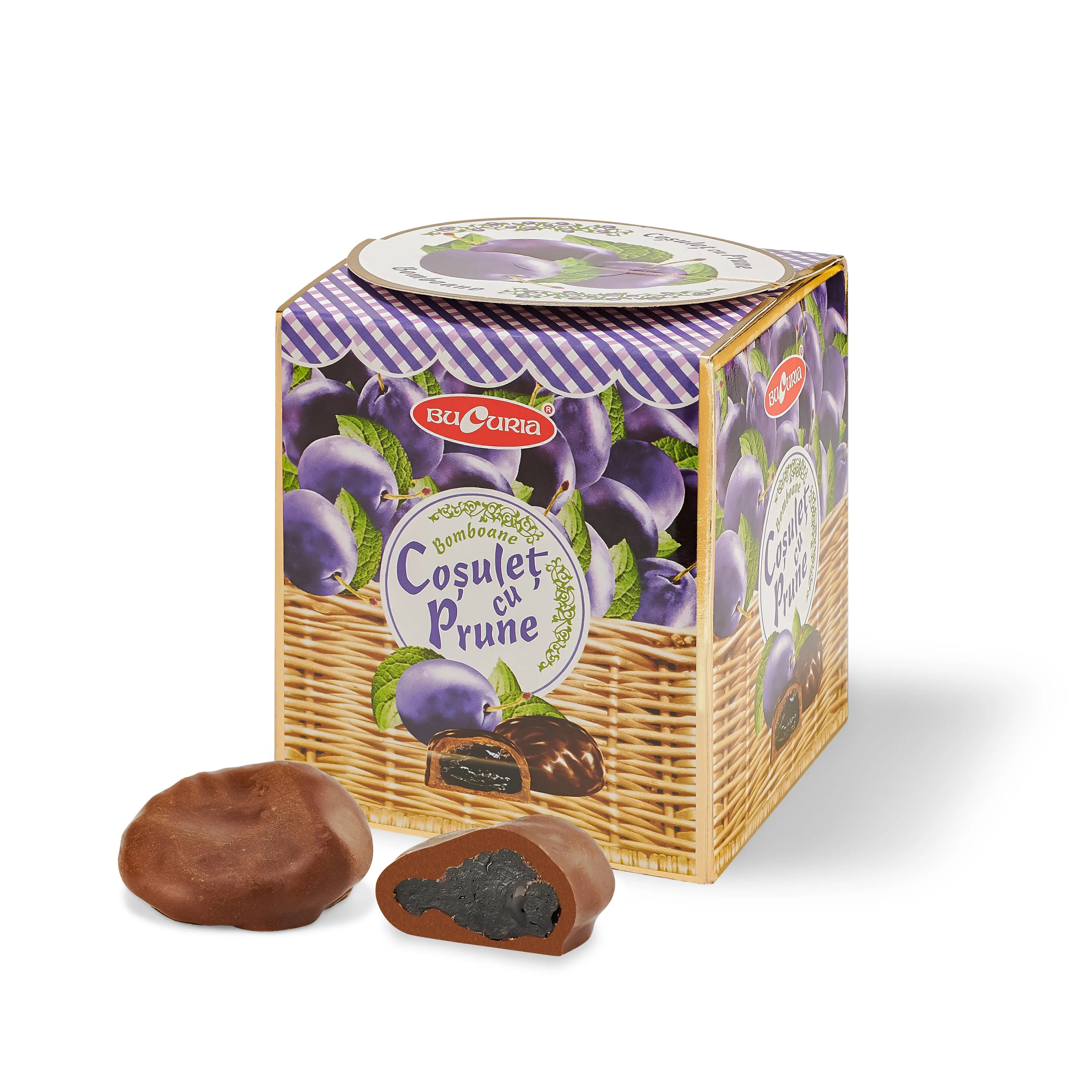 Descoperă Coșuleț cu Prune, una dintre cele mai apreciate specialități Bucuria – un desert fin, cu glazură de ciocolată și umplutură densă din pastă aromată de prune. Gustul intens de fructe, combinat cu ciocolata delicată, transformă fiecare bomboană într-o experiență dulce autentic moldovenească 🍫🍇.