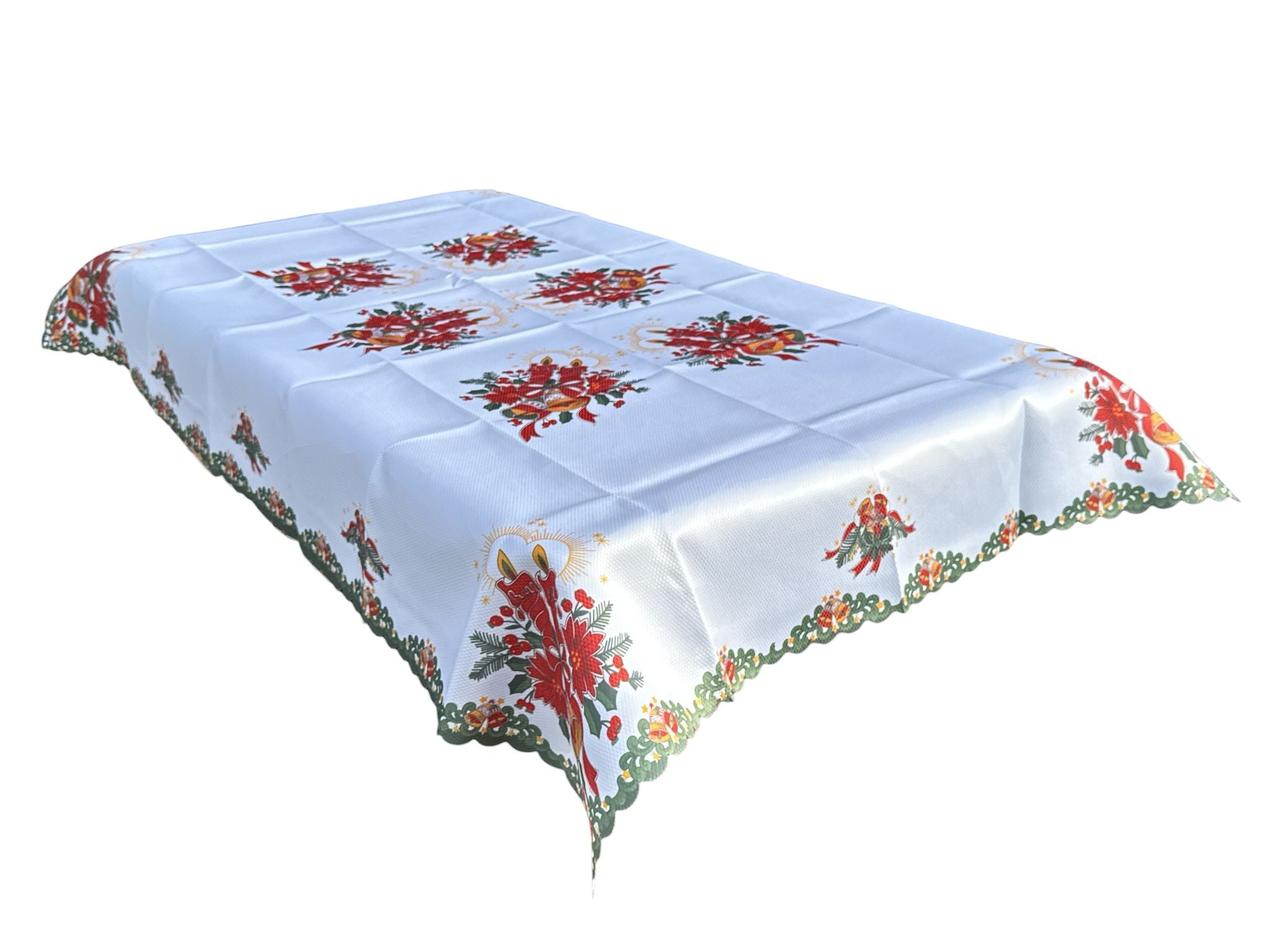 Fața de masă este realizată din material rezistent, ușor de curățat, cu imprimaj clar și culori vibrante. Modelul prezintă aranjamente florale de Crăciun, lumânări decorative și accente aurii, perfecte pentru atmosfera de sărbătoare.
