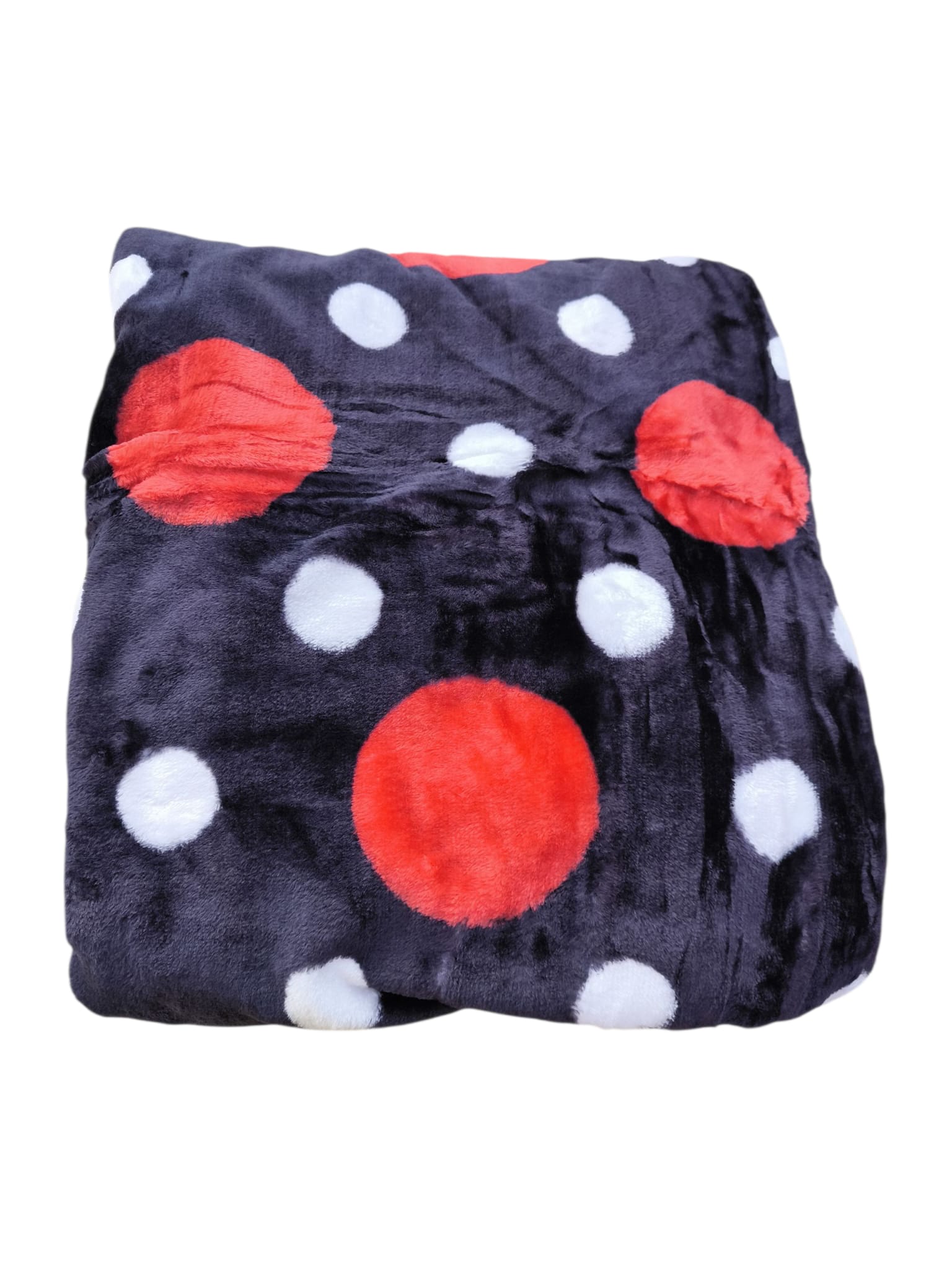 Această pătură dublă groasă impresionează prin designul său modern cu buline roșii și albe pe fundal negru intens, aducând un aer elegant și vesel în același timp.