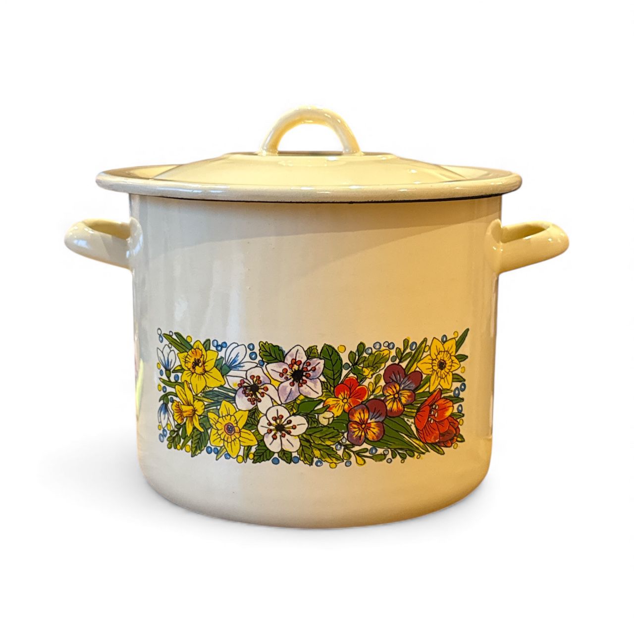 🍲 Oală Emailată Crem cu Flori – 4 Litri, cu Capac – Oțel Emailat, Fabricat în România
