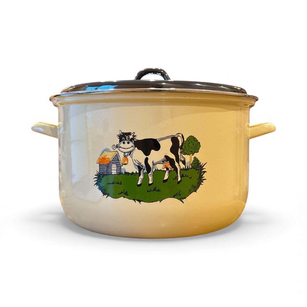 - 🍲 Oală Emailată Joasă 30 cm cu Capac – Decor Vacă la Fermă – ~10 Litri, Fabricată în România 🍲 Oală Emailată Joasă 30 cm cu Capac – Decor Vacă la Fermă – ~10 Litri, Fabricată în România