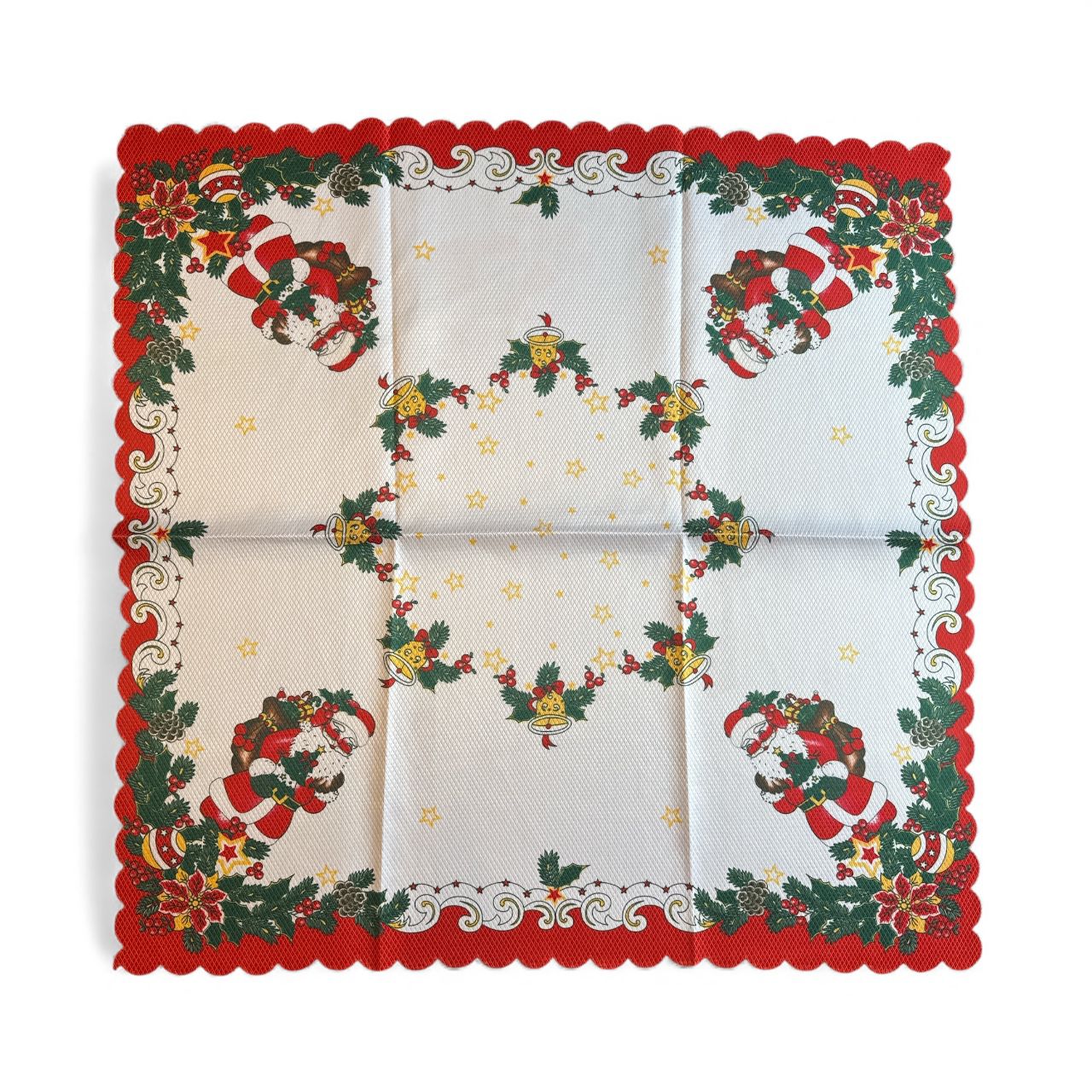 🎅🔔 Față de Masă Crăciun – 85×85 cm – Model Moș Crăciun, Clopoței & Margine Roșie