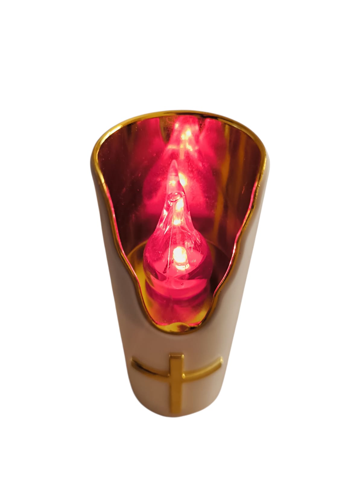🕯️✨ Candela electronică albă cu flacără roșie și cruce aurie – 125x50 mm – Subito