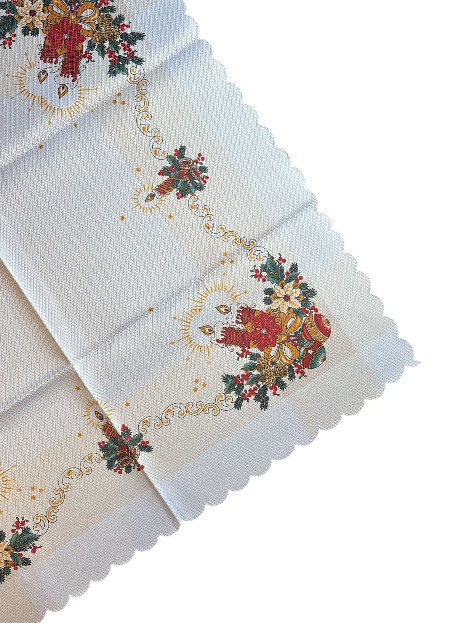 Creează o atmosferă caldă, luminoasă și perfect festivă cu această față de masă decorativă 85×85 cm, ideală pentru mese pătrate sau rotunde, comode, mese de cafea sau pentru decorarea unei încăperi tematice de Crăciun.