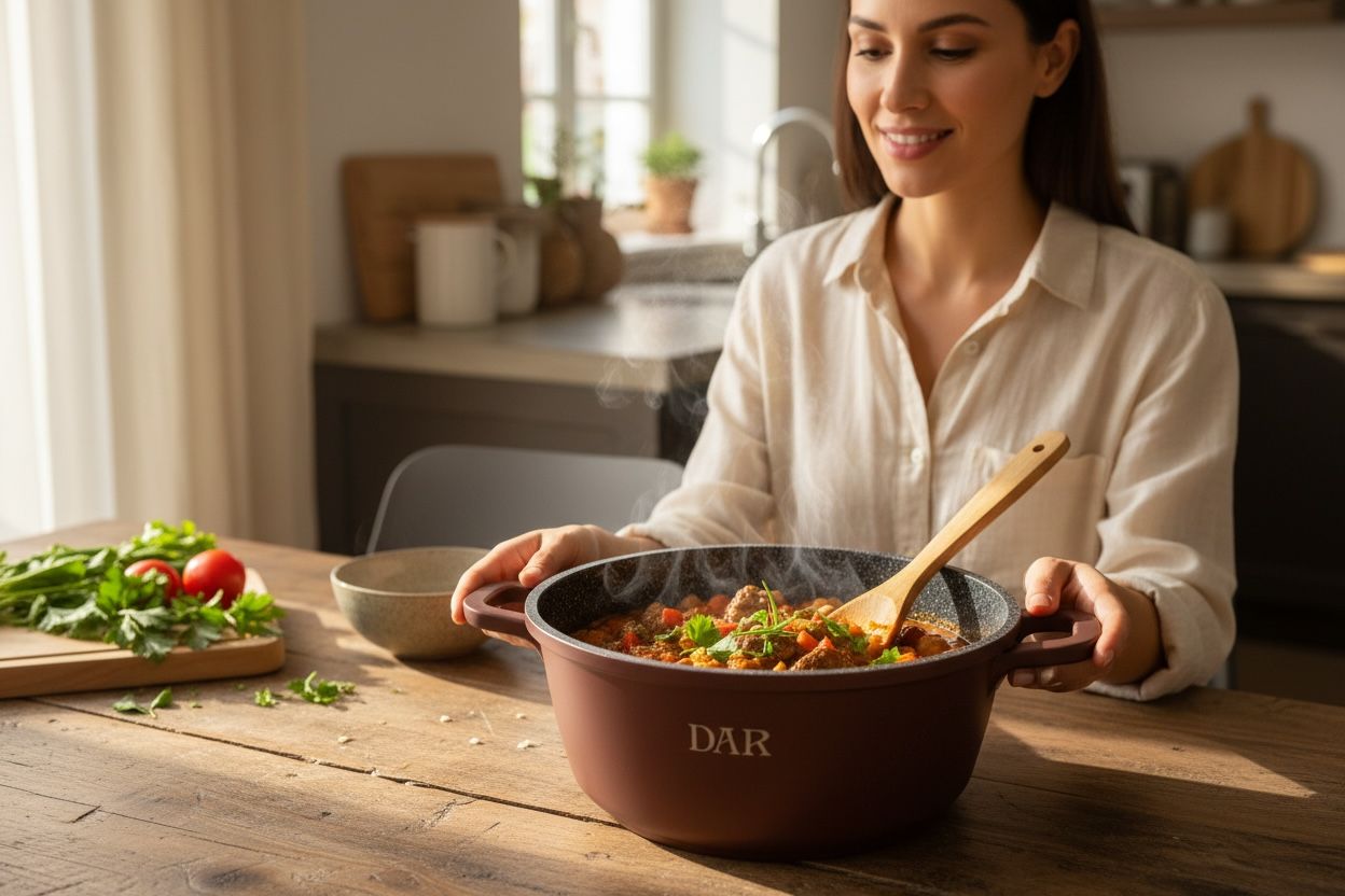 Cratita DAR de 22 cm, cu o capacitate de 2.5 litri, este ideala pentru gatitul zilnic, fiind perfecta pentru prepararea portiilor medii pentru 2-3 persoane. Versatila si practica, aceasta cratita este potrivita pentru supe, sosuri, tocanite sau alte preparate delicioase.