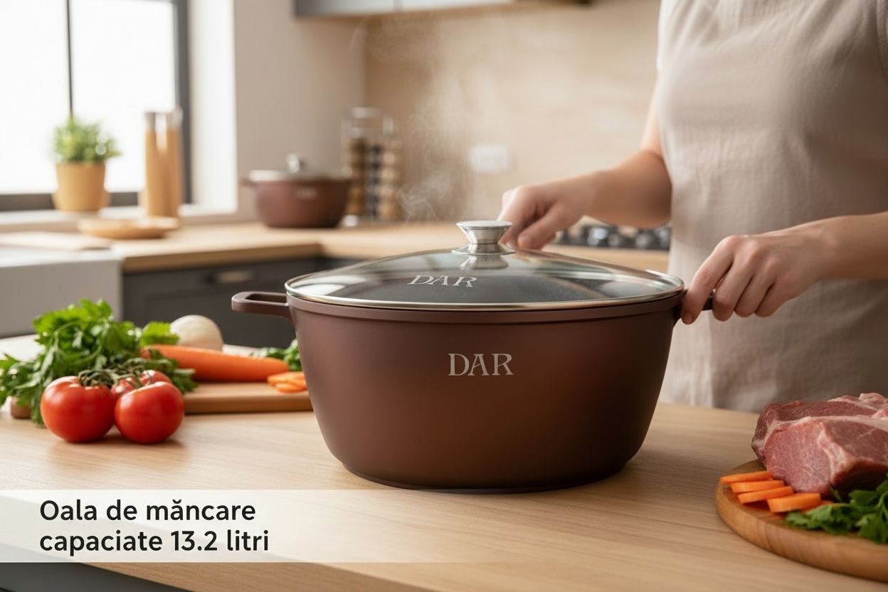 Cratița DAR de 36 cm, cu o capacitate mare de 13.2 litri, este alegerea perfectă pentru gătit în cantități mari – ideală pentru familii numeroase, evenimente, sărbători sau preparate tradiționale românești.