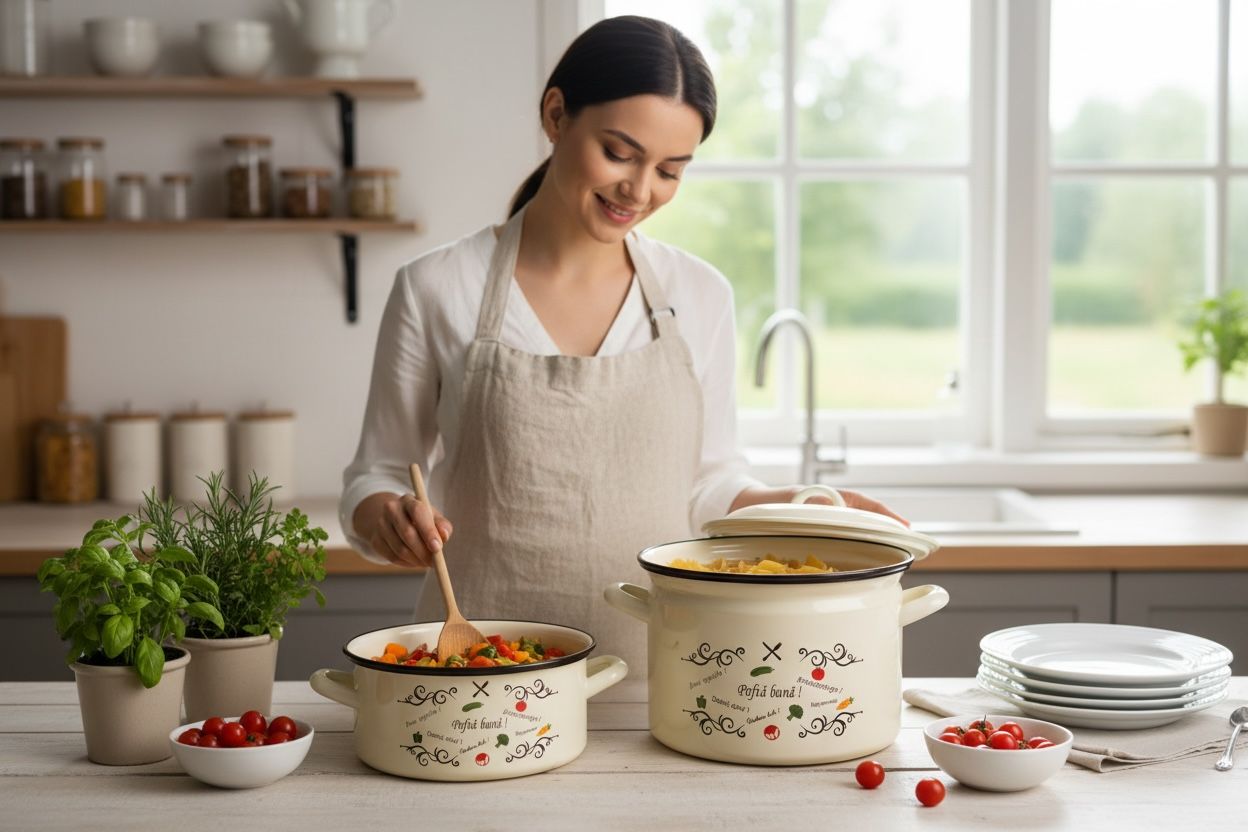 Designul decorativ cu mesajul „Pofta buna” ofera un aspect placut si cald, potrivit in orice bucatarie clasica sau moderna. Vasele sunt realizate din metal emailat, usor de curatat si potrivit pentru utilizare frecventa.