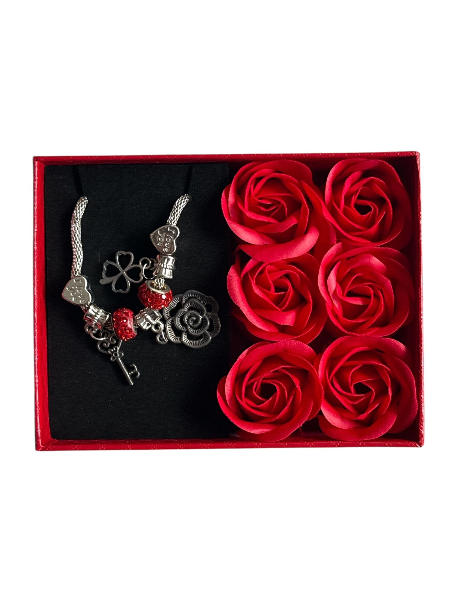 Setul conține o brățară decorativă cu charm-uri și trandafiri artificiali roșii, aranjați elegant într-o cutie premium cu fereastră transparentă. Vine împreună cu pungă de cadou asortată, gata de oferit.