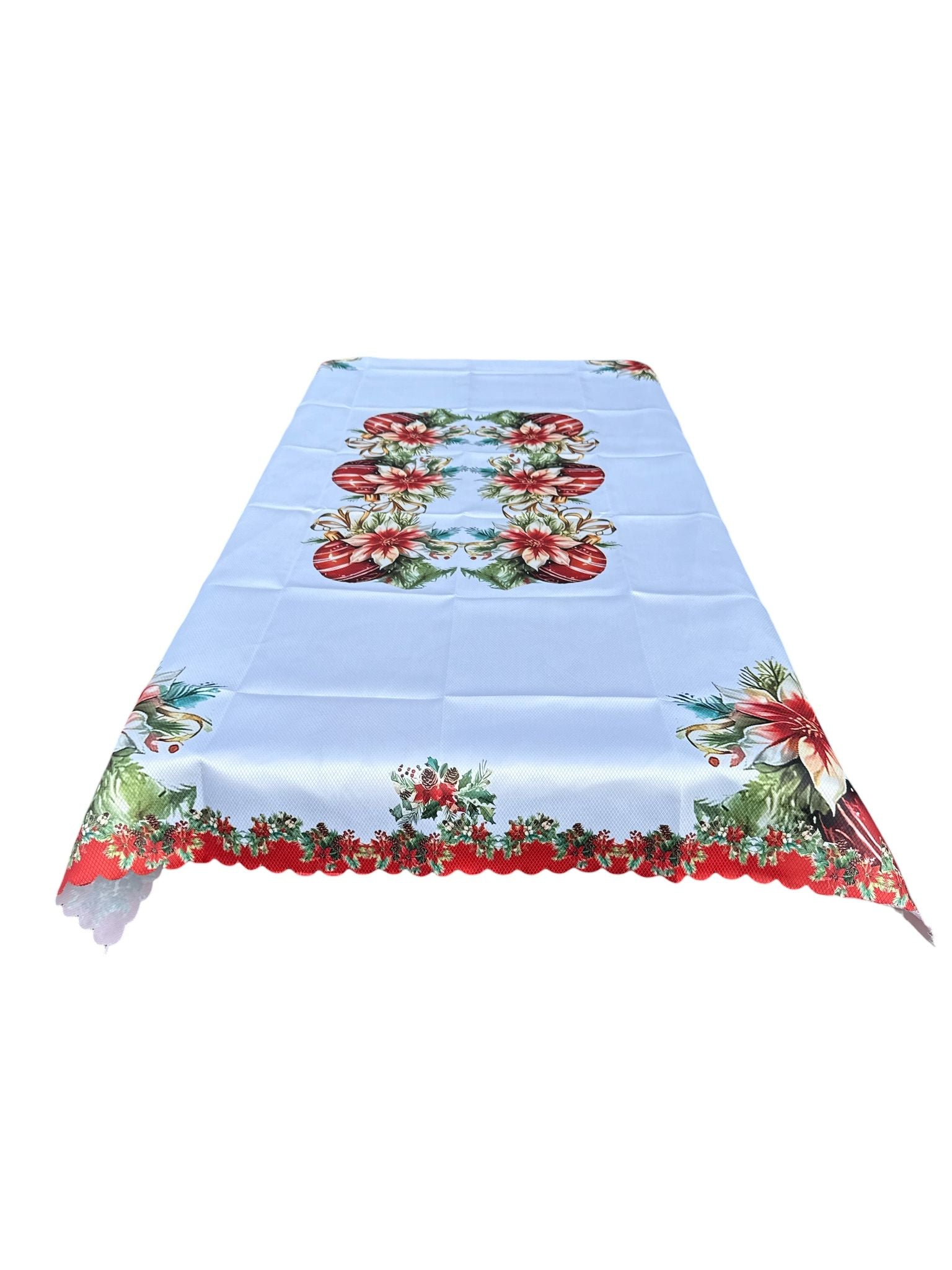 Adaugă un plus de farmec sărbătorilor cu această față de masă elegantă, decorată cu flori de poinsettia, globuri festive și detalii de sezon. Perfectă pentru mesele în familie, cine festive sau decorarea unei mese mari din living.