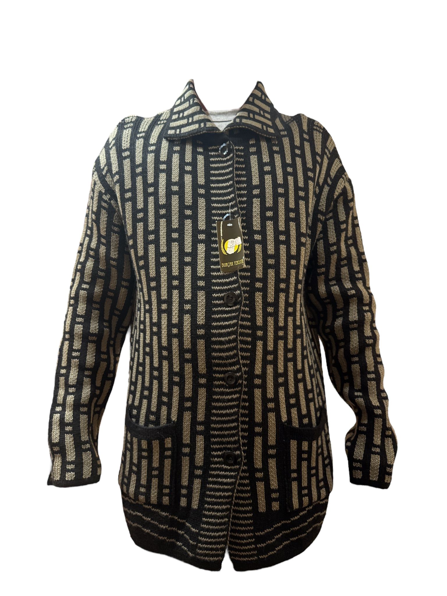 🧥 Cardigan tricotat bej cu negru – design geometric modern, confort și rafinament 🤎🖤