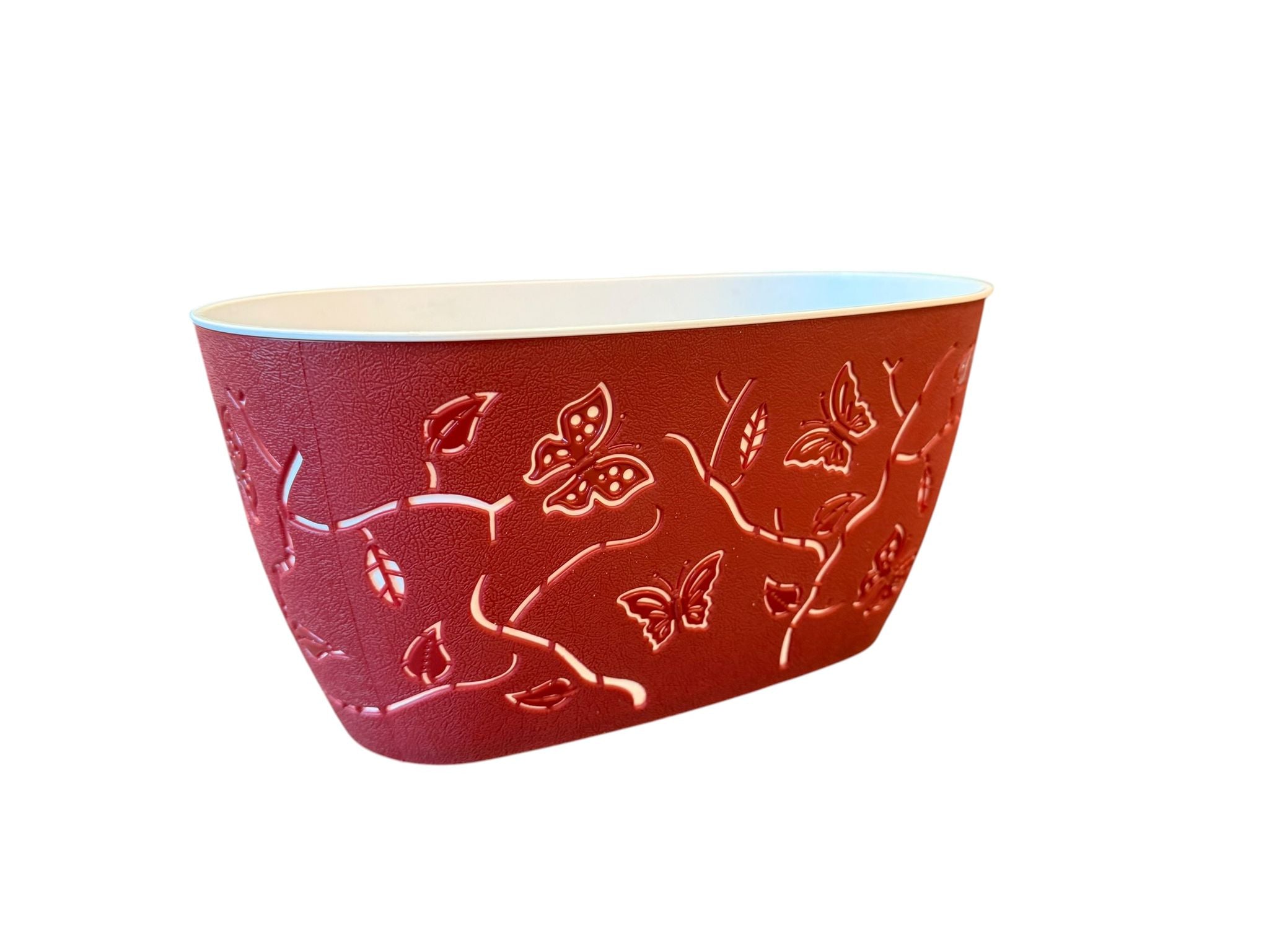 Adauga un plus de stil si culoare spatiului tau cu acest ghiveci oval decorativ, realizat intr-o nuanta eleganta de rosu si decorat cu un model delicat cu fluturi si ramuri. Este ideal pentru plante naturale, flori decorative sau aranjamente artificiale, fiind potrivit atat pentru interior, cat si pentru balcon, terasa sau veranda.